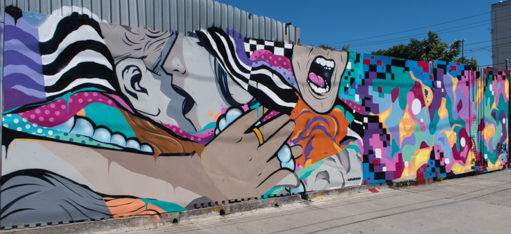 Explore large-scale murals by some of the top street and graffiti artists in the world in the Williamsburg neighborhood of Brooklyn, New York. Learn about the artists behind them including Aiko, Buff Monster, Cernesto Wonder, Galo, How and Nosm, Icy and Sot, Invader, Microbo, R. Robots, ROA, Robots Will Kill, Tristan Eaton, and Zed1.