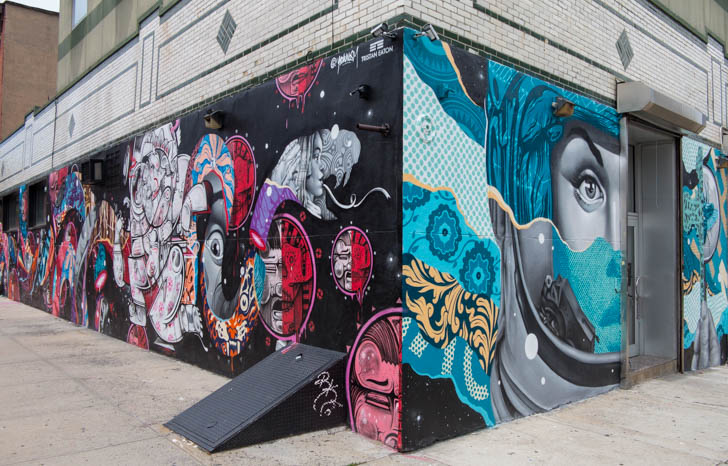 Explore large-scale murals by some of the top street and graffiti artists in the world in the Williamsburg neighborhood of Brooklyn, New York. Learn about the artists behind them including Aiko, Buff Monster, Cernesto Wonder, Galo, How and Nosm, Icy and Sot, Invader, Microbo, R. Robots, ROA, Robots Will Kill, Tristan Eaton, and Zed1.